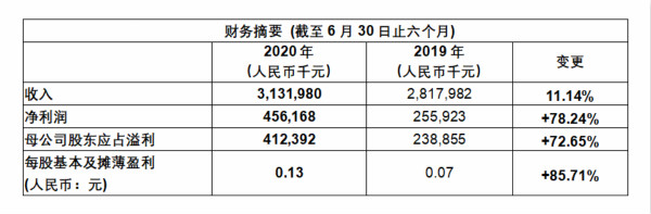 2020年上半年,在新冠肺炎疫情蔓延、地缘政治危机、大宗商品价格大幅震荡及各国货币宽松政策的影响下。公司以“大战、大考、机遇”为工作主线,扎实开展“五优竞赛”、“攻坚行动”、“结对帮扶”等活动,取得了来之不易的发展成绩。上半年,公司收入约为人民币3,131,980,000元,比去年同期增长了约11.14%,销售收入增长的主要原因是2020年上半年黄金价格大幅上升及科学生产组织所致。净利润约为人民币456,168,000元,比去年同期增长了约78.24%,超过去年全年438,235,000元的净利润规模。母公司股东应占溢利约民币412,392,000元,比去年同期增长约72.65%。半年业绩仅次于2012年上半年的495,398,000元,创8年来最好业绩。每股基本及摊薄盈利约人民币0.13元,比去年同期增长了约85.71%。