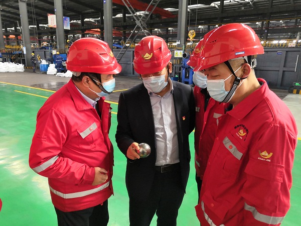 在调研现场,翁占斌董事长与企业经营层领导及一线员工深入交流,详细了解了企业基本情况和生产经营状况,查看了耐磨钢球的生产情况,仔细询问了原材料供应及产品品质。在随后的调研座谈会上,翁总提出了促进企业发展的六点要求。