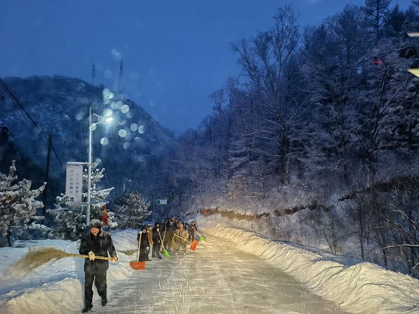 “冰”来将挡,雪来“土”掩。领导干部带头迅速行动,全员出动清扫道路积雪,采取人工、推土机等清除冰雪,铺沙垫道,开辟出了一条通往料场的通道。一辆辆满载着矿石的车辆慢慢起动,机器轰鸣,往来繁忙。虽然是冰天雪地,但是大家干的热火朝天,没有一个喊累,没有一个提前离开,手冷了就搓搓手,脚冷了就跺跺脚,雪下一层清理一层,大家坚守在路旁,全力保障道路畅通。