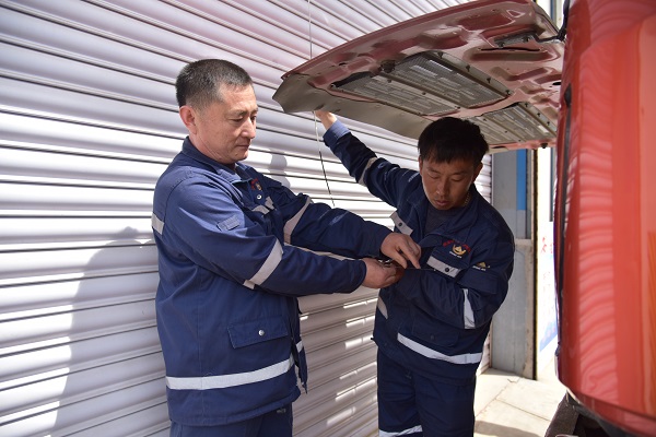 孙治庆是车队公认的“老师傅”。“首先要仔细检查一下仪表、灯光、雨刮、车门、玻璃等有没有故障,再看看转向系统、刹车系统等设施是否灵敏有效……”4月21日清晨,春暖乍寒,在金翅岭金矿停车场,师傅孙治庆正专心地指导着徒弟进行出车前的车辆“十检”。