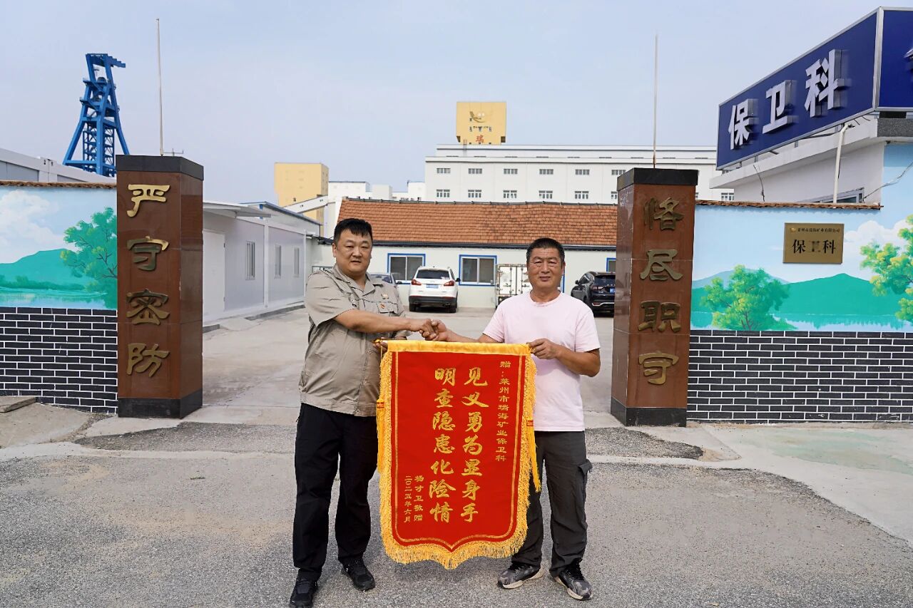 近日,司机老杨将一面印有“见义勇为显身手,明察隐患化险情”的锦旗送到了莱州市瑞海矿业有限公司分管保卫负责人的手中。“感谢瑞海矿业帮我保住了一车货物,更保住了我们的公益林”紧紧握住负责人员的手,老杨的感激之情溢于言表。