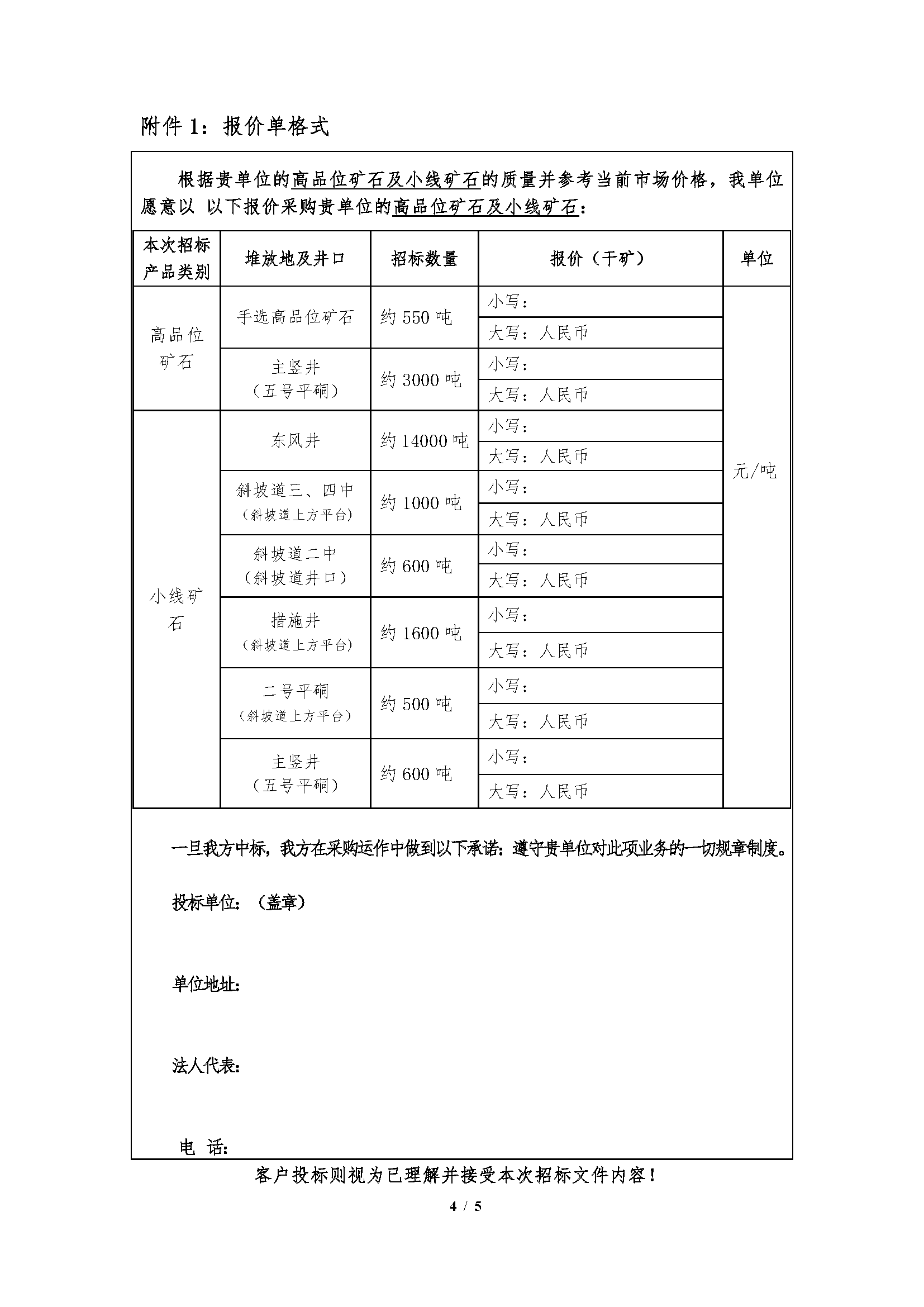 注:本次招标产品数量为预估数,投标按干矿报价,中标结算湿矿以实际过磅数为准,水分按2%扣除计算干矿(小线矿石产品水分由中标人及我公司相关科室、车间人员现场取样、我公司化验室的水分数据为准。)。如中标人需要,我公司开具甘肃省增值税普通发票(黄金)。