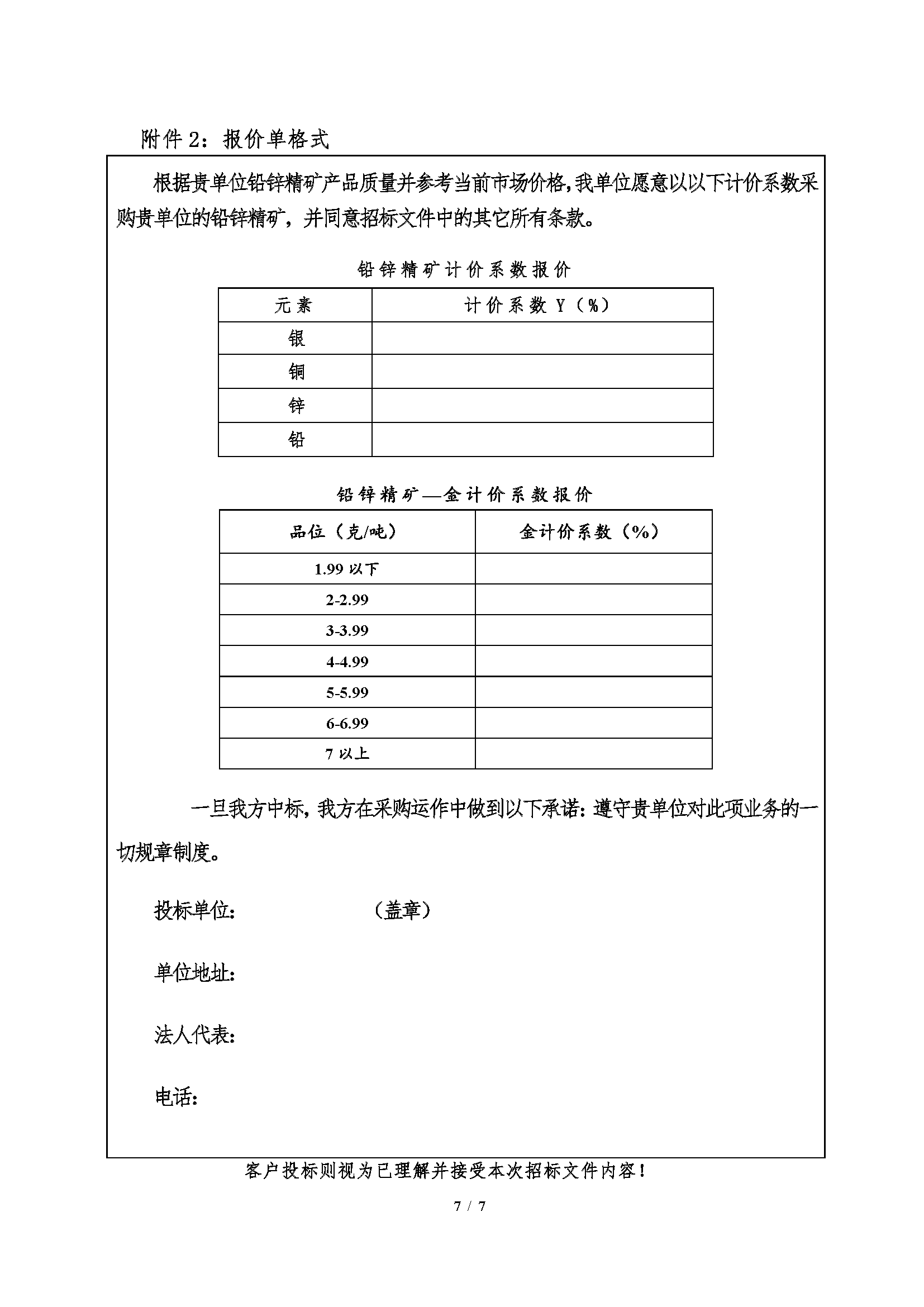 2.本次招标为一次性报价,在标书报送截止后现场制定底标并在规定时间内进行开标。本次招标以我单位检测的本批次矿各元素平均品位对应的报价系数测算出综合单价,每干吨矿计算的价值最高者得。
