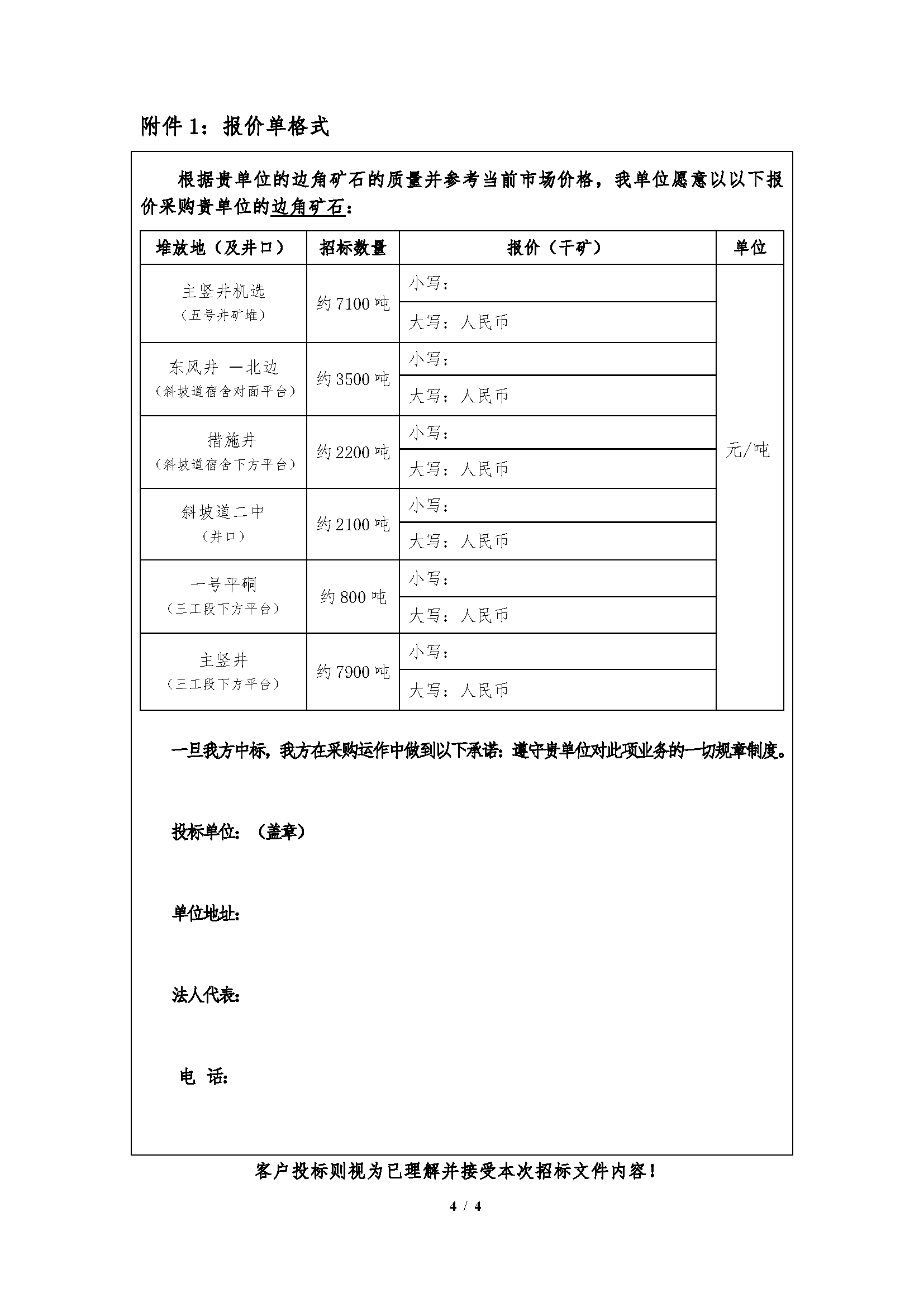 4.如无异议,请投标人将此招标文件和报价单加盖企业公章(或按捺手印)原件扫描后发送至指定投标邮箱;报价单所需填写的数据原则上要求电子版,若手写须大小写注明,如有涂改、不清晰或大小写不一致的视为废标。其他未尽事宜,以中标后签订的合同条款约定为准。