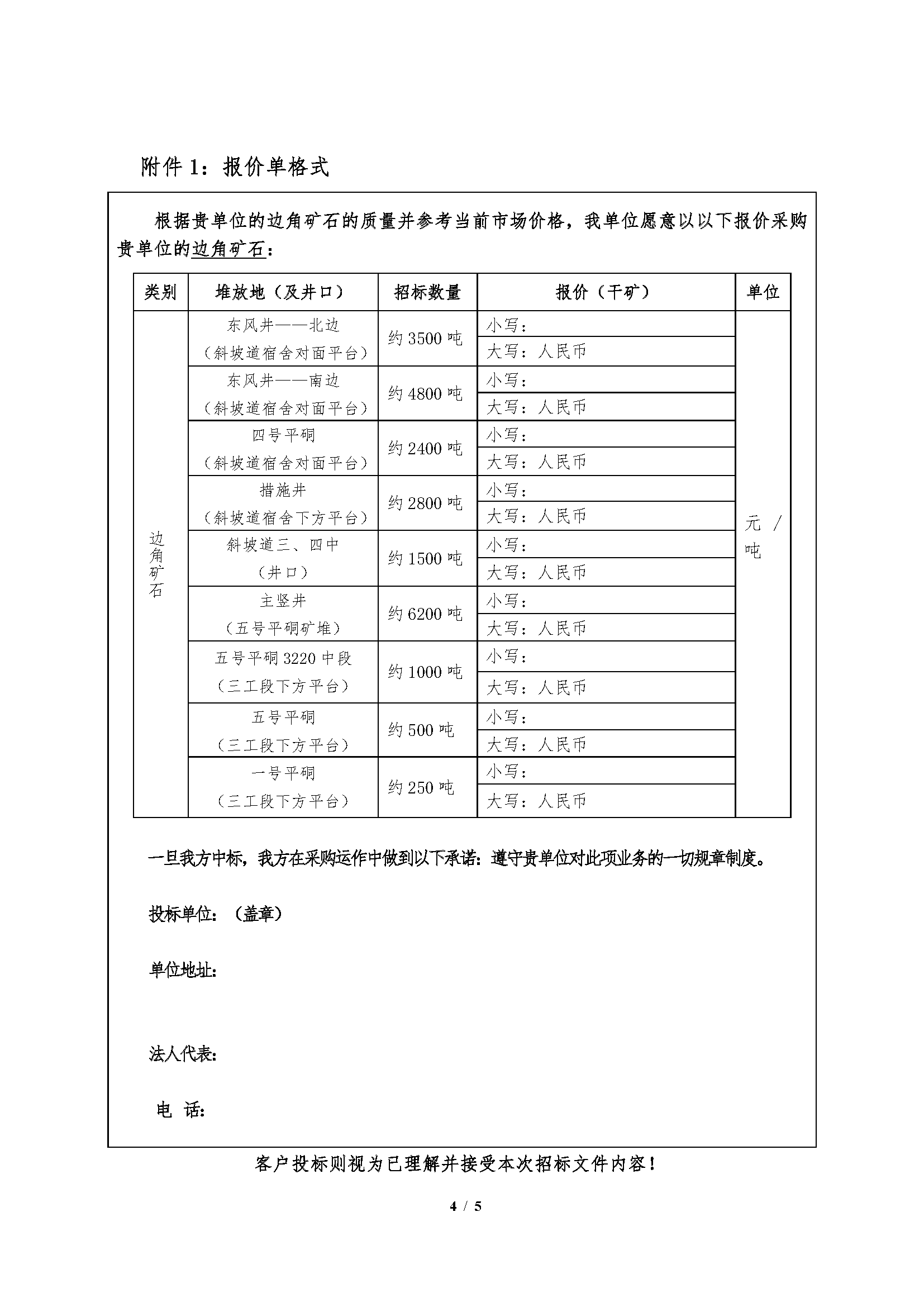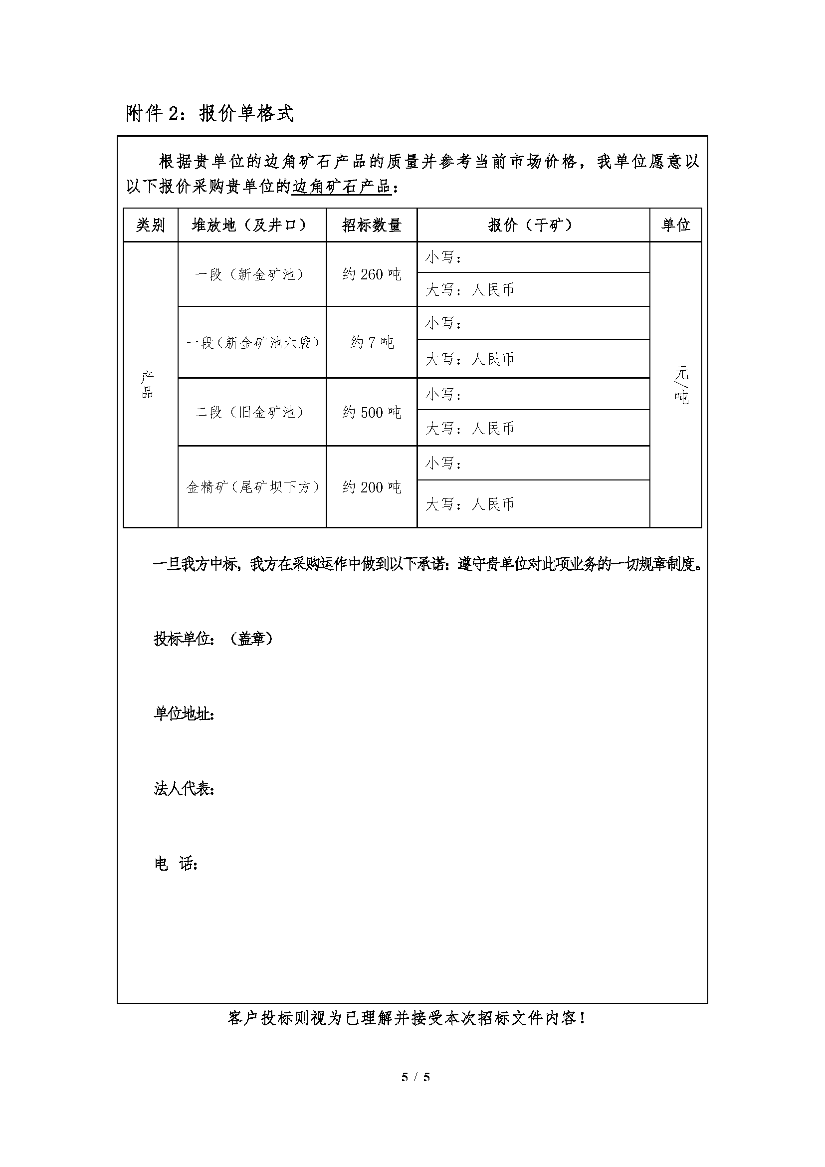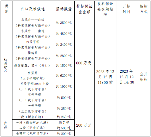 注:本次招标产品数量为预估数,投标按干矿报价,中标结算湿矿以实际过磅数为准,边角矿石水分按2%扣除计算干矿,产品水分由中标人及我公司相关科室、车间人员现场取样、我公司化验室的水分数据为准。如中标人需要,我公司开具甘肃省增值税普通发票(黄金)。