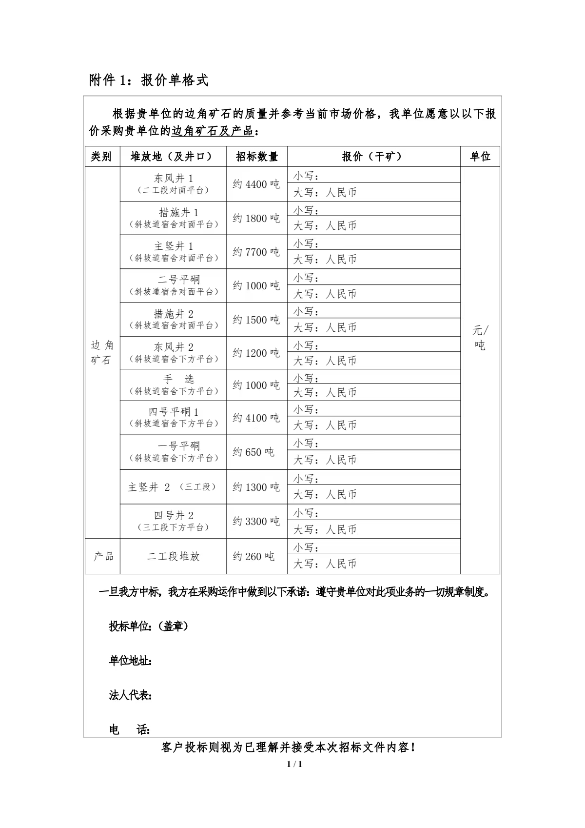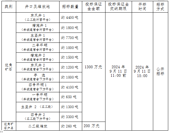 注:本次招标产品数量为预估数,投标按干矿报价,中标结算湿矿以实际过磅数为准,水分按2%扣除计算干矿;边角矿石产品水分由中标人及我公司相关科室、车间人员现场取样、我公司化验的水分数据为准。如中标人需要,我公司开具甘肃省增值税普通发票(黄金)。
