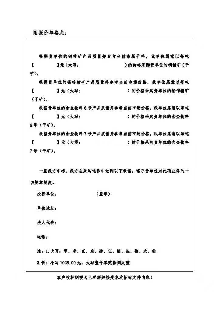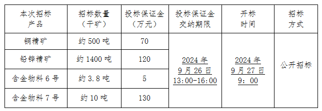 本次招标副产品为我公司铜精矿、铅锌精矿、含金物料。投标人需提供“三证合一”的营业执照复印件(个人提供身份证复印件)、法人授权委托书(原件)并加盖企业公章,于2024年9月25日16:00前将上述材料送交我公司企管审计科进行审核,审核合格后的单位应于2024年9月26日下午13时-16时交纳投标保证金(见下表,保证金须以转账方式支付)。如在2024年9月26日下午16时前投标保证金未足额汇入我公司账户则视为放弃本次投标;若投标人最终未中标,则由投标人开具收款收据后,我公司将一次性无息退还投标保证金。