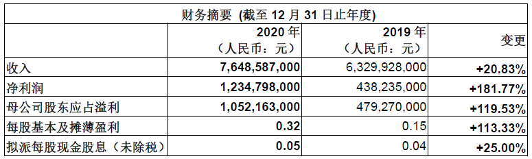 2021年3月24日–公司公布截至2020年12月31日止年度之全年业绩。2020年度业绩全面向好,核心指标同比大增实